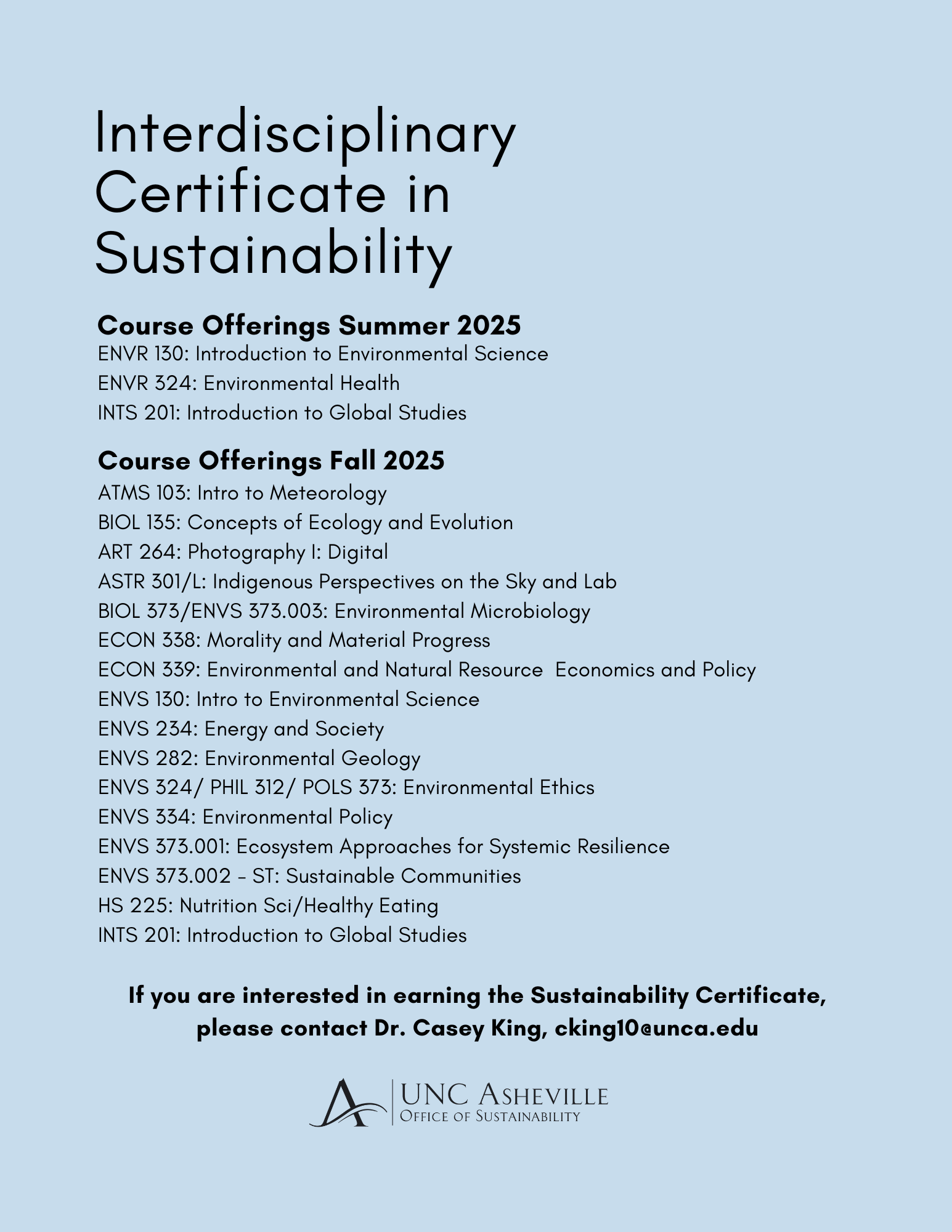 In 2020, UNC Asheville launched an Interdisciplinary Certificate in Sustainability. Visit the Sustainability Curriculum web page to learn more about course requirements.