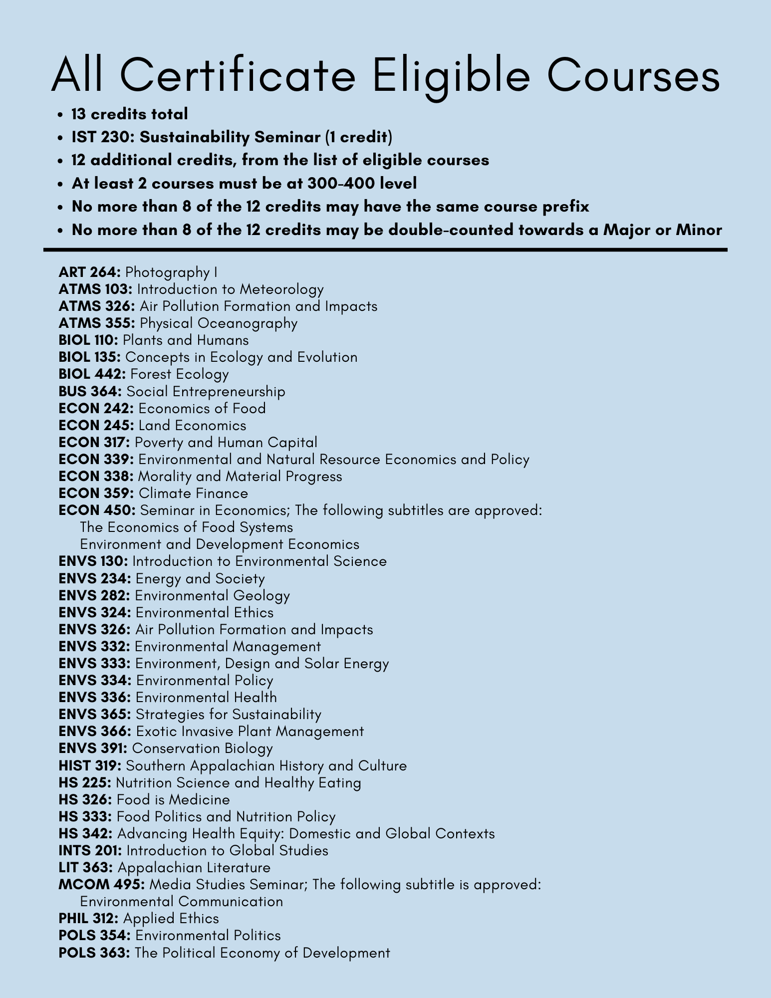 ATMS 103 – Introduction to Meteorology (3), BIOL 110 – Plants and Humans (3), BIOL 135 – Concepts in Ecology and Evolution (3), ECON 242 – Economics of Food (4), ECON 245 – Land Economics (4), ECON 339 – Environmental and Natural Resource Economics and Policy (4), ECON 338 – Morality and Material Progress (4), ECON 450 – Seminar in Economics (4), ENVR 130 – Introduction to Environmental Science (3), ENVR 234 – Energy and Society (3), ENVR 324 – Environmental Ethics (3), ENVR 332 – Environmental Management (3), ENVR 333 – Environment, Design and Solar Energy (3), ENVR 336 – Environmental Health (3), ENVR 365 – Strategies for Sustainability (3), HIST 319 – Southern Appalachian History and Culture (4), HWP 225 – Nutrition Science and Healthy Eating (4), HWP 333 – Food Politics and Nutrition Policy (4), INTS 201 – Introduction to Global Studies (4), LIT 363 – Appalachian Literature (4), MCOM 495 – Media Studies Seminar (4), PHIL 312 – Applied Ethics (3-4), POLS 354 – Environmental Politics (4), POLS 363 – The Political Economy of Development (4)